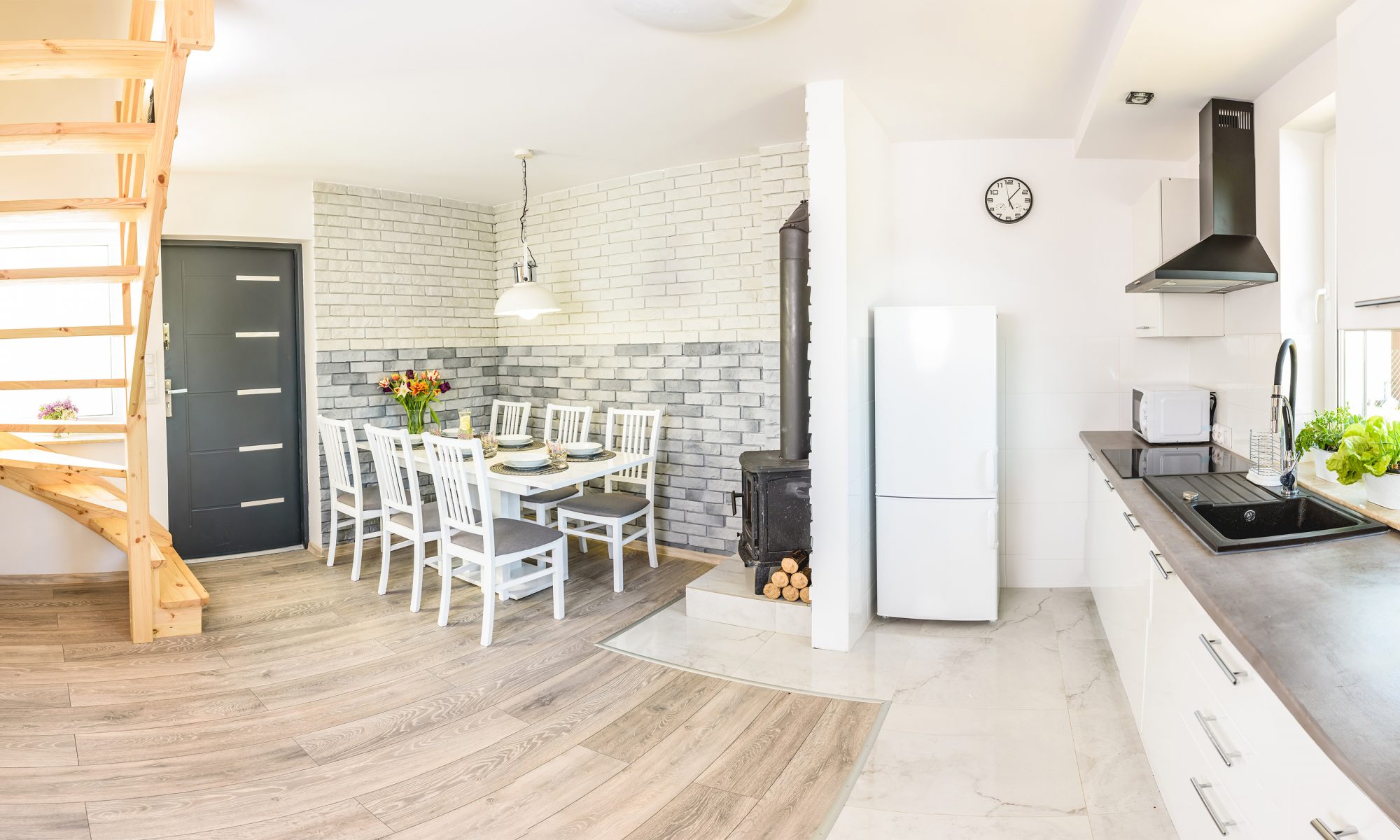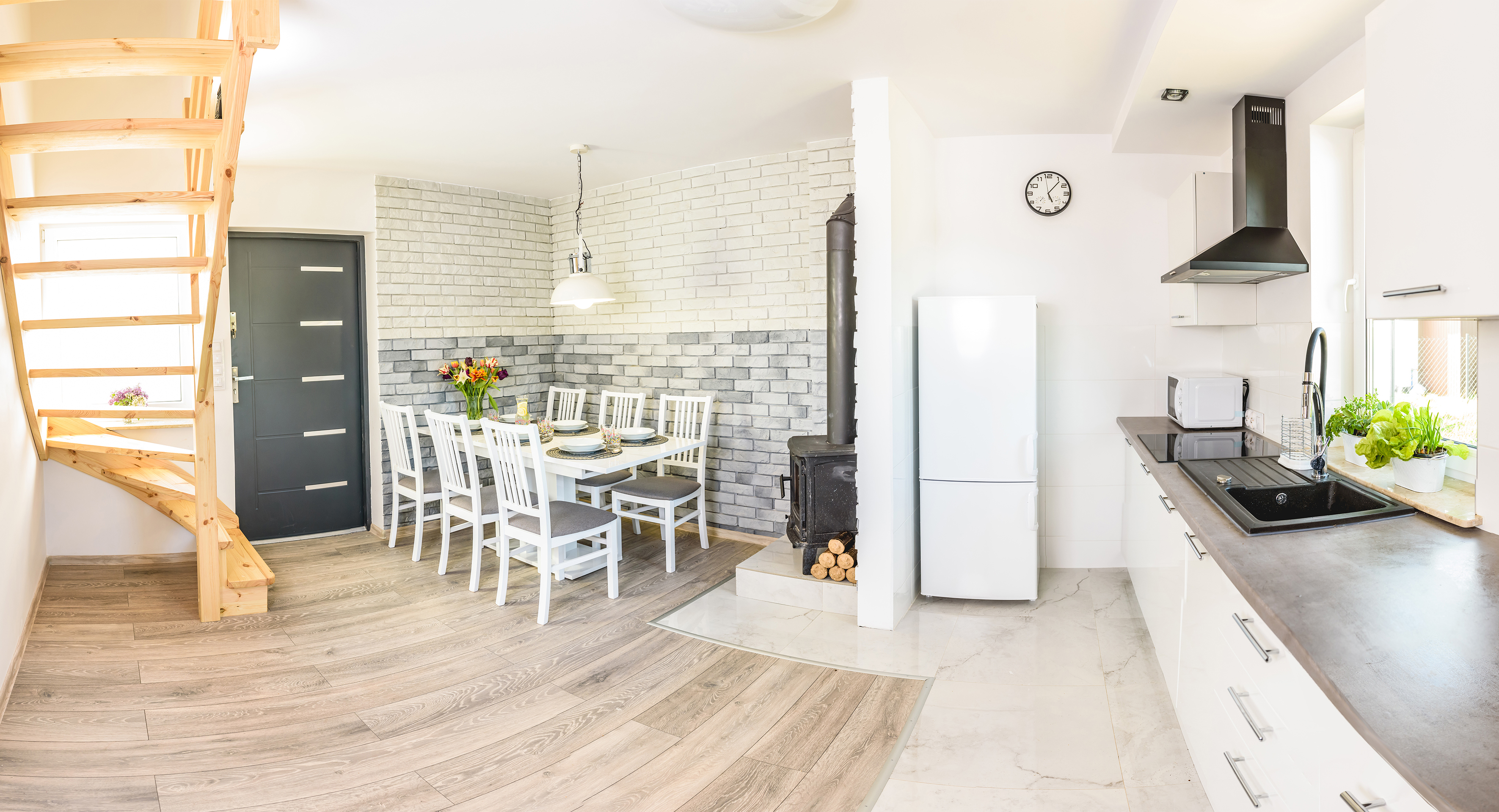 W tym pomieszczeniu znajduje się rozkładany stół (max na 8 osób). Kuchnia wyposażona jest w lodówkę z zamrażarką, płytę indukcyjna 4-palnikową, kuchenkę mikrofalową, czajnik elektryczny, zmywarkę oraz pralkę. Zastawa stołowa dla 12 osób. W chłodne dni możliwość ogrzania się tzw. „kozą.”